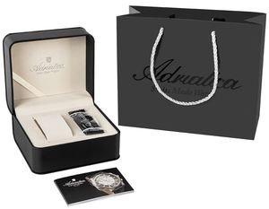 ZESTAW ZEGAREK + PUDEŁKO - DETALE MAJĄ ZNACZENIE. Do zegarka otrzymujesz eleganckie, firmowe pudełko Adriatica w klasycznej czarno-kremowej kolorystyce, ozdobione subtelnym logo marki. Całość doskonale oddaje szwajcarską precyzję i prestiż marki Adriatica. W zestawie znajduje się również elegancka, firmowa ściereczka z mikrofibry – idealna do pielęgnacji tarczy i bransolety zegarka, by zachować jego blask na co dzień.