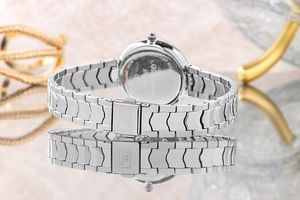 KOBIECA KONSTRUKCJA NA TWOIM NADGARSTKU. Damski zegarek o średnicy 31 mm i grubości 7 mm to idealne połączenie delikatności i wyrafinowanego stylu. Jego lekka konstrukcja (56 g) i elegancka bransoleta zapewniają wyjątkowy komfort noszenia, sprawiając, że zegarek niemal stapia się ze skórą. Dzięki swoim kompaktowym wymiarom podkreśla kobiecy nadgarstek bez efektu przytłoczenia, tworząc doskonały akcent każdej stylizacji. To wyjątkowy wybór dla kobiet, które cenią sobie subtelną elegancję i oczekują od zegarka klasycznego designu.