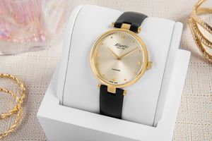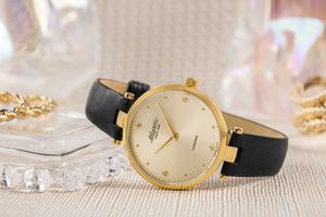 WYGODNY PASEK SKÓRZANY. Zegarek został wyposażony w elegancki pasek wykonany z wysokiej jakości naturalnej skóry, utrzymany w głębokim, czarnym kolorze. Jego subtelna faktura i miękkość sprawiają, że doskonale dopasowuje się do nadgarstka, gwarantując wygodę noszenia przez cały dzień. Skórzany pasek nie tylko podkreśla luksusowy charakter zegarka, ale także dodaje mu klasy i sprawia, że model idealnie komponuje się zarówno w eleganckim stylu, jak i codziennym ubiorem. Czarna tonacja paska pięknie współgra z kopertą w odcieniu złota oraz złotą tarczą, tworząc harmonijną i wyrazistą całość. Solidne zapięcie zapewnia bezpieczeństwo, a wytrzymała skóra to gwarancja trwałości i ponadczasowego stylu.