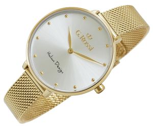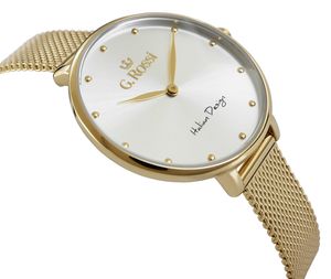ODROBINA LUKSUSOWEGO CHARAKTERU. Złote wskazówki i logo G.Rossi z koroną nadają całości szlachetności, a bransoleta typu mesh o szerokości 12 mm oplata nadgarstek jak elegancka, złota wstęga, łącząc wygodę z ponadczasowym stylem. Ten zegarek jest wyrazem wyrafinowanego minimalizmu – doskonały dla kobiet, które szukają czegoś wyjątkowego, a jednocześnie subtelnego. G.Rossi 11890B3-3D1 to nie tylko czasomierz, ale i biżuteria, dodająca blasku każdej chwili.