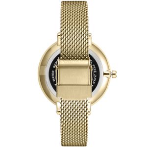PEREŁKA SUBTELNEJ ELEGANCJI. Model zaprojektowany z myślą o kobiecie, która ceni delikatne, ale wyraziste akcenty. Smukły, bo o grubości zaledwie 5,5 mm, lekki niczym muśnięcie, ważący jedynie 46 gram, idealnie układa się na nadgarstku, dodając uroku każdej stylizacji. Metaliczna tarcza w kolorze szampana otulona złotą kopertą błyszczy dyskretnie, a zamiast tradycyjnych indeksów – delikatne złote kropeczki wyznaczają godziny, tworząc na tarczy małe, lśniące punkty.