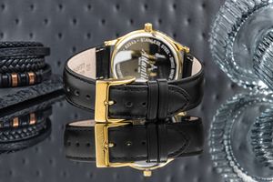 WYGODNY CZARNY PASEK SKÓRZANY. Zegarek został wyposażony w elegancki pasek wykonany z wysokiej jakości naturalnej skóry, utrzymany w głębokim, czarnym kolorze. Jego subtelna faktura i miękkość sprawiają, że doskonale dopasowuje się do nadgarstka, gwarantując wygodę noszenia przez cały dzień. Skórzany pasek nie tylko podkreśla luksusowy charakter zegarka, ale także dodaje mu klasy i sprawia, że model idealnie komponuje się zarówno w eleganckim stylu, jak i codziennym ubiorem. Czarna tonacja paska pięknie współgra z kopertą w odcieniu złota oraz złotą tarczą, tworząc harmonijną i wyrazistą całość. Solidne zapięcie zapewnia bezpieczeństwo, a wytrzymała skóra to gwarancja trwałości i ponadczasowego stylu.