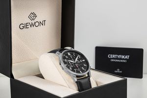 GIEWONT - ELEGANCJA I MODNY STYL. Zegarek męski Giewont GW5630-A2 to doskonałe połączenie lotniczej stylistyki, funkcjonalności i nowoczesnej prezencji, stworzone z myślą o mężczyźnie, który szuka w zegarku czegoś więcej niż tylko odmierzania czasu. Czytelna tarcza o charakterystycznym pilotowym układzie przyciąga wzrok dużymi cyframi arabskimi oraz perfekcyjnie rozmieszczonymi subtarczami chronografu, które dodają całości technicznego wyrafinowania i podkreślają dynamiczny charakter modelu. Szkiełko szafirowe zapewnia spektakularną przejrzystość i wyjątkową odporność na zarysowania, dzięki czemu zegarek przez długi czas zachowuje nienaganny wygląd i wysoką prezencję.Koperta prezentuje się nowocześnie i wyraziście, zachowując przy tym elegancką linię i solidną konstrukcję. Idealnie współgra z wysokiej jakości skórzanym paskiem, którego gładka faktura i staranne przeszycia podkreślają klasę czasomierza, zapewniając jednocześnie wygodne dopasowanie do nadgarstka. Proporcje tarczy, geometryczne akcenty i wyraziste wskazówki tworzą harmonijną całość, nadając modelowi przejrzystości, głębi i ponadczasowego stylu. Giewont GW5630-A2 to propozycja dla mężczyzny świadomego swojej wartości, dla kogoś, kto wybiera dodatki dopracowane, charakterne i reprezentujące wysoki poziom estetyki. Zegarek robi wrażenie zarówno z daleka, jak i z bliska, zachwycając detalami, funkcjonalnością i pewnym siebie stylem. To model, który nie tylko uzupełnia wizerunek, ale potrafi go dopełnić i podkreślić.