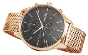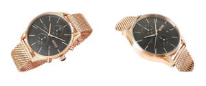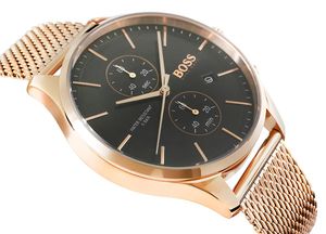 Zegarek męski Hugo Boss 1513806 wyposażony jest w działające chronografy: minut stopera, sekund stopera oraz datownikiem dni miesiąca. Komfortowa, stalowa bransoleta typu Mesh, to znakomite uzupełnienie tego zegarka. Rodzaj bransolety jest gwarancją solidności i wygody podczas codziennego użytkowania. Komfort dopełnia odpowiednia jakośc stali, która komfortowo dopasowuje się do męskiego nadgarstka. Zapięcie sygnowane jest logiem marki Hugo Boss, co podnosi prestiż zegarka i zapewnia wyjątkowość na tle innych marek zegarków. Zegarek ze szkiełkiem mineralnym to dobry wybór jeżeli chcesz swobodnie korzystać z zegarka na co dzień. Ten rodzaj szkiełka wyprodukowany na bazie krzemu jest znacznie twardszy od szkła syntetycznego. Szkiełko mineralne pełni przede wszystkim funkcje ochronne- osłania tarczę zegarka przed uszkodzeniami i zabrudzeniami. Mineralne szkiełka, są również bardzo elastyczne, a przy tym mniej podatne na stłuczenia i bardziej wytrzymałe podczas codziennego użytkowania. Zegarek posiada klasę wodoszczelności na poziomie 5 BAR, co oznacza, że zegarek odporny jest na deszcz, przypadkowe zalania i zachlapania. Teraz nie musisz rozstawać się ze swoim ulubionym zegarkiem nawet na chwilę.