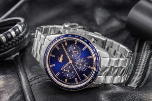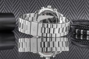 DODATKOWE MOŻLIWOŚCI. Na tarczy znajdziesz trzy subtarcze chronografu, które dodają zegarkowi sportowego sznytu i zwiększają jego funkcjonalność. Są one odpowiedzialne za precyzyjne mierzenie czasu, minut i sekund, a także za funkcję 24-godzinnego zegara. Każda z subtarcz jest idealnie zintegrowana z resztą tarczy, tworząc harmonijną, a jednocześnie dynamiczną kompozycję. Za pomocą bocznych przycisków można łatwo zarządzać funkcjami chronografu – jednym uruchamiasz i zatrzymujesz stoper, a drugim resetujesz go do zera. Dzięki intuicyjnej obsłudze i przemyślanemu rozmieszczeniu subtarcz, ten model idealnie łączy styl z praktycznymi możliwościami.