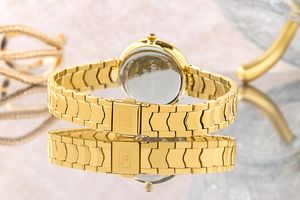 SEGMENTOWANA BRANSOLETA – ELEGANCJA Z KLASĄ. Wykonana z wysokiej jakości stali nierdzewnej, łączy elegancję z trwałością i komfortem noszenia. Zmysłowy charakter tej złotej bransolety sprawia, że doskonale układa się na kobiecym nadgarstku, delikatnie go oplatając i podkreślając jego kobiecość. Całość dopełnia subtelne logo na zapięciu bransolety, które stanowi ekskluzywny akcent. Eleganckie i praktyczne zapięcie umożliwia łatwe zakładanie i zdejmowanie zegarka oraz zachowuje smukły wygląd bransolety po zapięciu. Wielostopniowy mechanizm zapobiega przypadkowemu odpięciu zegarka, a całe zapięcie jest dyskretne i dobrze komponuje się z bransoletą.