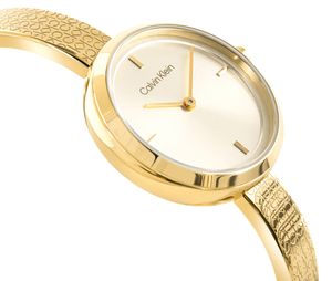 Zegarek CALVIN KLEIN Iconic to esencja minimalistycznej elegancji, która idealnie wpisuje się w estetykę nowoczesnej kobiety. Jego projekt wyróżnia się subtelną tarczą o promienistym szlifie słonecznym w złotej tonacji, która pięknie odbija światło i nadaje czasomierzowi wysublimowany charakter. Charakterystycznym elementem modelu jest półsztywna bransoleta typu bangle, o delikatnie zaokrąglonym, owalnym profilu. Dzięki swojej konstrukcji perfekcyjnie układa się na nadgarstku, tworząc z nim niemal jedność — niczym elegancka obręcz biżuteryjna. Jej tłoczona, teksturowana powierzchnia, zdobiona powtarzającym się logotypem „ck Calvin Klein”, to modowy akcent, który nadaje bransolecie nowoczesnego, designerskiego charakteru i sprawia, że zegarek wyróżnia się na tle klasycznych modeli.