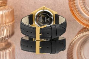 WYGODNY PASEK SKÓRZANY. Zegarek został wyposażony w elegancki pasek wykonany z wysokiej jakości naturalnej skóry, utrzymany w głębokim, czarnym kolorze. Jego subtelna faktura i miękkość sprawiają, że doskonale dopasowuje się do nadgarstka, gwarantując wygodę noszenia przez cały dzień. Skórzany pasek nie tylko podkreśla luksusowy charakter zegarka, ale także dodaje mu klasy i sprawia, że model idealnie komponuje się zarówno w eleganckim stylu, jak i codziennym ubiorem. Czarna tonacja paska pięknie współgra z kopertą w odcieniu złota oraz złotą tarczą, tworząc harmonijną i wyrazistą całość. Solidne zapięcie zapewnia bezpieczeństwo, a wytrzymała skóra to gwarancja trwałości i ponadczasowego stylu.