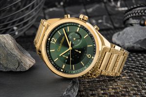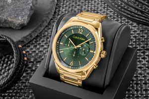 Model CALVIN KLEIN CK Force To projekt, który wybrzmiewa ciszą luksusu. Gładka, szczotkowana stal w odcieniu szampańskiego złota łączy się tu ze szmaragdową tarczą o dynamicznym efekcie sunray, który zmienia się zależnie od światła – niczym dobrze skalibrowany wyświetlacz. Geometryczna forma koperty w połączeniu ze szczotkowaną powierzchnią robi efekt „wow” bez zbędnego błysku. Trzy subtarcze odpowiadają za funkcję 24-godzinnego trybu, datownika oraz dnia tygodnia, zapewniając pełną kontrolę nad czasem. Ich układ został zaprojektowany tak, by zachować czytelność i równowagę wizualną całej tarczy. Całość zamyka solidna koperta z precyzyjnym bezelem, który podkreśla nowoczesny, męski styl. To zegarek, który płynnie przechodzi między biurem, spotkaniem biznesowym a wieczorem przy winie – bez zbędnych kompromisów. Zawsze z klasą, zawsze na poziomie.