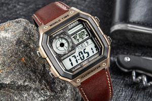 FUNKCJONALNOŚĆ TWOJEGO ZEGARKA. Casio AE-1200WH-1AVDF to wielofunkcyjny zegarek cyfrowy z wyświetlaczem LCD, zaprojektowany z myślą o osobach ceniących niezawodność, funkcjonalność i styl retro. Wyposażony jest w funkcję czasu światowego (World Time) z mapą świata i możliwością szybkiego przełączania między czterema zapisanymi strefami czasowymi, pięć niezależnych alarmów dziennych, sygnał pełnej godziny, stoper 1/100 sekundy działający do 24 godzin z funkcją międzyczasu (split time), timer odliczający od 1 sekundy do 24 godzin, automatyczny kalendarz uwzględniający lata przestępne, a także format wyświetlania 12/24 godziny. Dodatkowo posiada funkcję wyciszenia dźwięków przycisków, możliwość ustawienia czasu letniego (DST), podświetlenie LED z regulowanym czasem świecenia (1,5 lub 3 sekundy), tryb podwójnego czasu (Dual Time) oraz wskaźnik AM/PM. Zegarek jest zasilany baterią o żywotności do 10 lat, a jego wodoszczelność na poziomie 100 metrów (10 BAR) umożliwia bezpieczne użytkowanie podczas kontaktu z wodą i codziennych aktywności.