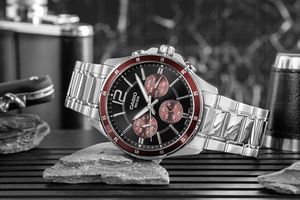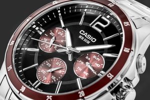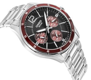 Zegarek Męski CASIO MTP-1374D-5AVDF. CASIO MTP-1374D-5AVDF to coś więcej niż zwykły zegarek – to niezawodny partner dla mężczyzny, który chce wyglądać stylowo w każdej sytuacji. Elegancka forma z nutą sportowego charakteru sprawia, że świetnie odnajduje się zarówno przy koszuli, jak i przy codziennym T-shircie. Czarna tarcza z srebrno czerwonymi akcentami przyciąga spojrzenia, a stalowa koperta i bransoleta z powłoką jonową (ion plated) zapewniają trwałość i odporność na zarysowania. Praktyczne subtarcze – dzień, data i czas 24-godzinny – pozwalają mieć wszystko pod kontrolą jednym rzutem oka. Dokładny mechanizm (±20 sekund/miesiąc) i wodoszczelność do 50 metrów sprawiają, że możesz go nosić bez obaw – w pracy, w podróży, nawet w deszczu. To klasyczny metalowy zegarek analogowy, który nie tylko wygląda dobrze, ale też działa wtedy, gdy go potrzebujesz.