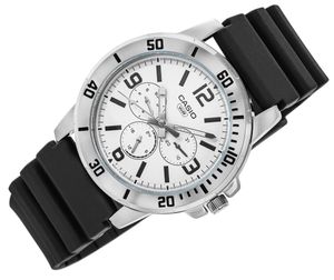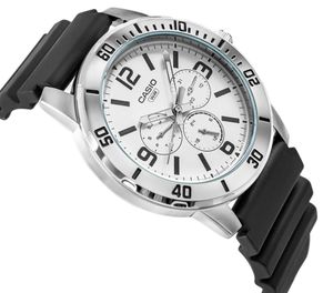 Zegarek Męski CASIO MTP-VD300-7BUDF. Casio MTP-VD300-7BUDF to klasyczny męski zegarek, który łączy w sobie elegancję i funkcjonalność w najlepszym wydaniu. Wyposażony w czytelną, białą tarczę z trzema subtelnie rozmieszczonymi subtarczami – datownikiem, wskazaniem dnia tygodnia i 24-godzinnym czasem – gwarantuje pełną kontrolę nad codziennym rytmem dnia. Stalowa koperta oraz solidna bransoleta zapewniają trwałość i ponadczasowy wygląd, który pasuje zarówno do garnituru, jak i casualowych stylizacji. Mineralne szkiełko chroni zegarek przed zarysowaniami, a precyzyjny mechanizm kwarcowy dba o niezawodność w każdej sytuacji. To propozycja dla mężczyzny, który ceni prostotę, styl i praktyczne rozwiązania w jednym akcesorium.