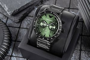 Zegarek Męski Emporio Armani Mario AR11472 + BOX. Zegarek męski Emporio Armani Mario AR11472 to elegancki i nowoczesny model o sportowym charakterze. Wykonany jest ze stali szlachetnej w czarnym kolorze, z kopertą o średnicy 43 mm i stalową bransoletą, która nadaje mu solidny i męski wygląd. Zielona tarcza z efektem sunray przyciąga uwagę i dodaje całości wyjątkowego stylu. Na tarczy umieszczono trzy subtarcze chronografu oraz datownik, dzięki czemu zegarek jest nie tylko stylowy, ale i funkcjonalny. Wskazówki oraz indeksy pokryte są masą luminescencyjną, co pozwala na odczyt godziny w ciemności. Całość chroni szkło mineralne odporne na przypadkowe zarysowania, a wodoszczelność 5 ATM zapewnia ochronę przed zachlapaniami i deszczem. Zegarek napędzany jest precyzyjnym mechanizmem kwarcowym, który gwarantuje dokładność i niezawodność. Emporio Armani Mario AR11472 to idealny wybór dla mężczyzny, który ceni elegancję, nowoczesny design i praktyczne rozwiązania w jednym stylowym dodatku.
