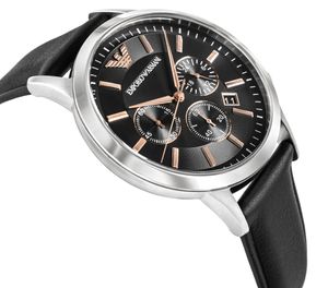 Zegarek Męski Emporio Armani Renato AR11431 to elegancki zegarek męski, który łączy klasyczny design z nowoczesnym charakterem. Koperta o średnicy 43 mm wykonana została ze stali szlachetnej w kolorze srebrnym, co gwarantuje trwałość oraz ponadczasowy wygląd. Czarna tarcza z subtelnym połyskiem podkreśla stylowy charakter modelu, a miedziane indeksy i wskazówki zapewniają doskonały styl. Zegarek wyposażono w funkcję chronografu oraz datownik umieszczony pomiędzy godziną 4 a 5, co zwiększa jego funkcjonalność na co dzień. Za precyzyjne działanie odpowiada niezawodny mechanizm kwarcowy, a całość chroni wytrzymałe szkło mineralne. Pasek ze skóry naturalnej o gładkiej strukturze doskonale komponuje się z kopertą, tworząc spójną i elegancką całość, idealną zarówno do garnituru, jak i do codziennego stroju. Model Emporio Armani Renato Chrono AR11431 to propozycja dla mężczyzn ceniących klasykę, jakość i prestiż włoskiego stylu.