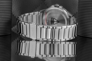 MOC I TRWAŁOŚĆ BRANSOLETY. Srebrna bransoleta, podobnie jak koperta, jest masywna, ale nieprzesadzona, chłodna w dotyku, wyrafinowana i solidna. Jest jak stalowa obręcz, która mocno trzyma zegarek na Twoim nadgarstku, przypominając Ci o sile i stabilności, jaką wnosi w Twój styl. Precyzyjnie wykonane zapięcie, opatrzone wytłoczonym logo, dopełnia ten mocny, męski charakter, dodając odrobinę elegancji i prestiżu. Srebrna koronka dyskretnie, ale skutecznie podkreśla całość, uzupełniając tę harmonijną kompozycję.