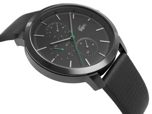 DESING PEŁEN CHARAKTERU. Całość utrzymana jest w głębokiej, matowej czerni, co nadaje mu wyrazistego, mocnego wyglądu. Zegarek wyróżniają subtelne zielone akcenty na wskazówkach, które dodają mu odrobinę dynamiki i nawiązują do klasycznego logo Lacoste. Wykonany z solidnych materiałów, zegarek posiada kopertę ze stali nierdzewnej, która zapewnia trwałość i elegancki wygląd. Jego czarny, teksturowany pasek ze skóry naturalnej idealnie wpisuje się w sportowy, a jednocześnie stylowy charakter tego modelu, zapewniając komfort noszenia przez cały dzień. Czarne logo Lacoste dumnie umieszczone na cyferblacie i sprzączce to znak prestiżu, który kojarzy się z ponadczasową jakością.