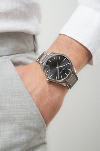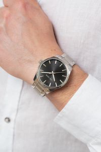MOCNA TRWAŁA BRANSOLETA. Wykonana z najwyższej jakości stali nierdzewnej to połączenie niezłomnej trwałości i luksusowego wykończenia, które robi wrażenie od pierwszego spojrzenia. Jej mocna, solidna konstrukcja zapewnia niezawodność i pewność, że zegarek będzie leżeć perfekcyjnie, bez względu na to, jak wymagający będzie Twój dzień. Precyzyjnie wykonane zapięcie, opatrzone wytłoczonym logo, dopełnia ten mocny, męski charakter, dodając odrobinę elegancji i prestiżu. Wielostopniowy mechanizm zapięcia zapobiega przypadkowemu odpięciu zegarka.