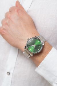 MOCNA TRWAŁA BRANSOLETA. Wykonana z najwyższej jakości stali nierdzewnej to połączenie niezłomnej trwałości i luksusowego wykończenia, które robi wrażenie od pierwszego spojrzenia. Jej mocna, solidna konstrukcja zapewnia niezawodność i pewność, że zegarek będzie leżeć perfekcyjnie, bez względu na to, jak wymagający będzie Twój dzień. Precyzyjnie wykonane zapięcie, opatrzone wytłoczonym logo, dopełnia ten mocny, męski charakter, dodając odrobinę elegancji i prestiżu. Wielostopniowy mechanizm zapięcia zapobiega przypadkowemu odpięciu zegarka.
