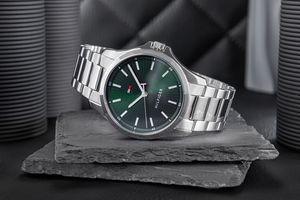 KOLORYSTYKA DOSKONAŁA - SREBRNY Z ZIELONYM AKCENTEM. Metaliczny srebrny kolor koperty i zielony tarczy, tworzą spójną harmonijną bazę podkreśloną logo , które dodają całości subtelnej dynamiki. Uwagę przyciąga kolor zielony, który wprowadza świeżość i nadaje zegarkowi unikalnego charakteru. Srebrna bransoleta idealnie uzupełnia całość, czyniąc ten model idealnym wyborem dla mężczyzn, którzy szukają nieoczywistego, ale eleganckiego dodatku na każdą okazję.