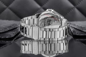 MOC I TRWAŁOŚĆ BRANSOLETY. Wykonana z doskonałej stali nierdzewnej, łączy surową trwałość z luksusowym wykończeniem, które robi wrażenie na każdym kroku. Jej solidna konstrukcja to nie tylko gwarancja niezawodności, ale także pewność, że zegarek będzie leżeć idealnie, niezależnie od tego, co przyniesie dzień. Precyzyjne zapięcie z wytłoczonym logo dopełnia całości, dodając nutę klasy i wyjątkowego charakteru. To bransoleta, która mówi "siła" i "styl" jednym, zdecydowanym ruchem. Prestiż zegarka podkreśla dyskretne logo na zapięciu bransolety.