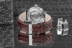 RETRO ELEGANCJA W LOTNICZYM STYLU. Srebrna koperta o klasycznej formie otacza beżową tarczę, która przykuwa wzrok subtelną głębią koloru, idealnie komponując się z precyzyjnymi srebrnymi indeksami i srebrno czarnymi wskazówkami, zapewniając dobrą czytelność. Dynamiczny charakter podkreśla czarny sekundnik, a całość zamyka ciemno brązowy, skórzany pasek z kontrastującą białą nitką, który dodaje elegancji i klasy, idealnie współgrając ze srebrną sprzączką i koronką. To kwintesencja stylu i wyrafinowania, gdzie każdy detal został zaprojektowany z myślą o perfekcji.